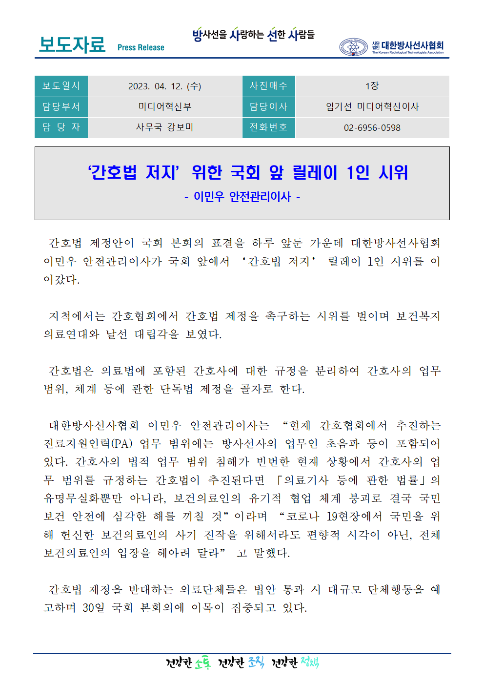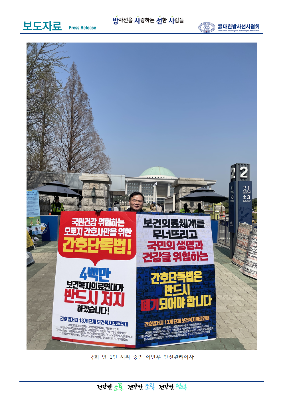 [미디어혁신부] ‘간호법 저지’ 위한 국회 앞 릴레이 1인 시위_이민우 안전관리이사 페이지 정보 작성자관리자6 댓글0 조회2,267 작성일23.04.12 12:44 본문 Comment 0 댓글목록 등록된 댓글이 없습니다.