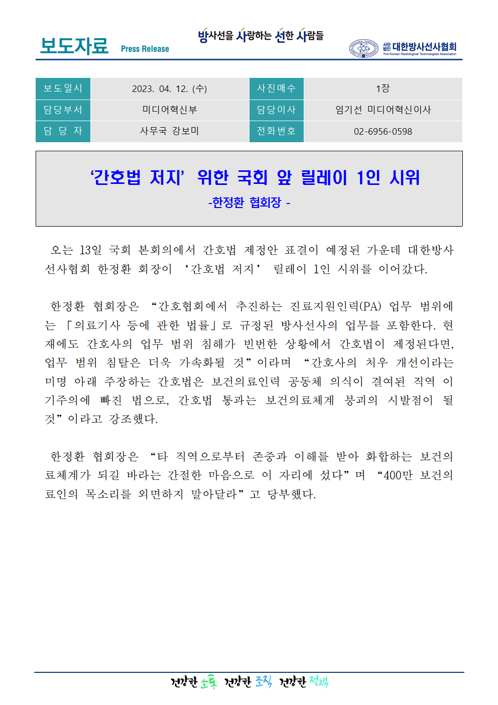 [미디어혁신부] ‘간호법 저지’ 위한 국회 앞 릴레이 1인 시위_한정환 협회장 페이지 정보 작성자관리자6 댓글0 조회2,259 작성일23.04.12 12:50 본문 Comment 0 댓글목록 등록된 댓글이 없습니다.