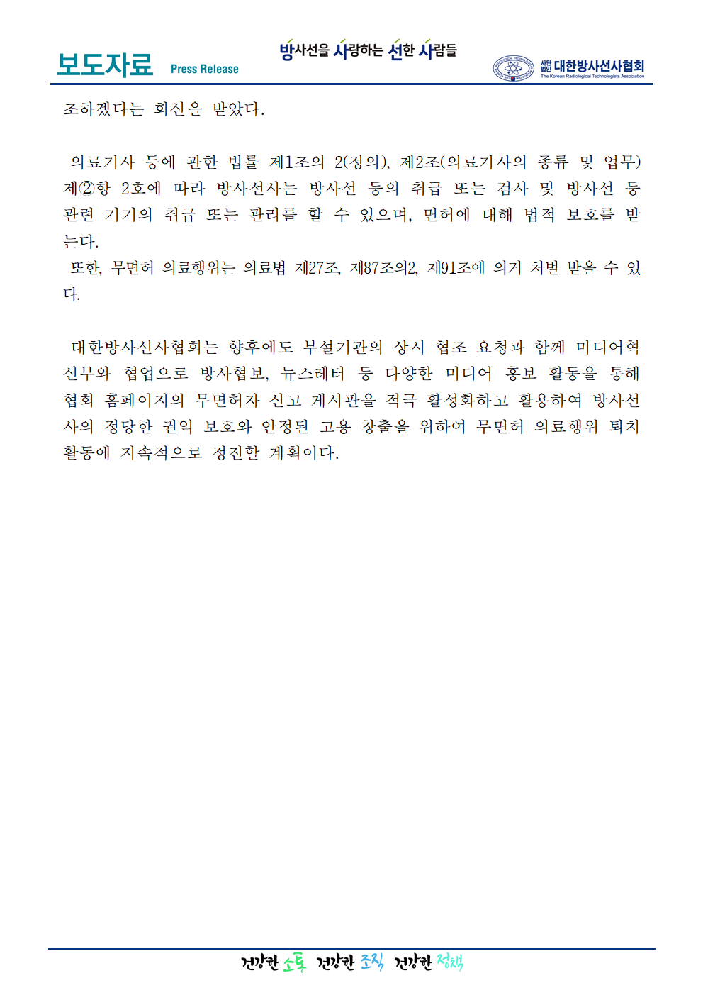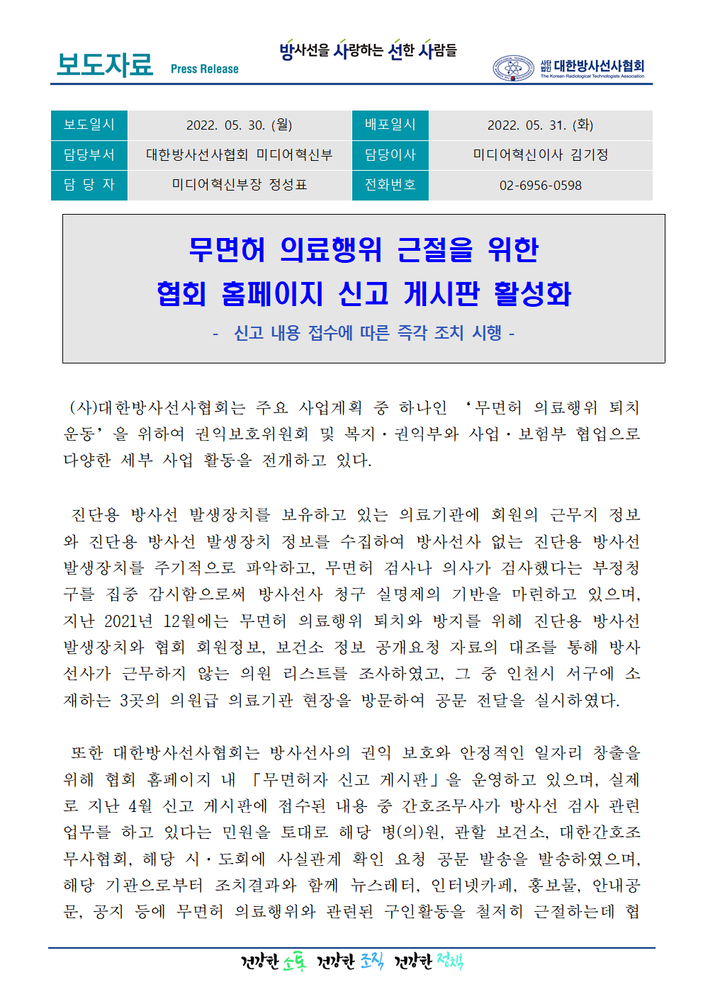 [미디어혁신부 42] 무면허 의료행위 근절을 위한 협회 홈페이지 신고 게시판 활성화 페이지 정보 작성자관리자6 댓글0 조회2,630 작성일22.06.02 14:25 첨부파일 보도자료42(220531)_무면허 의료행위 근절을 위한 협회 홈페이지 신고 게시판 활성화.pdf (116.5K) 23회 다운로드 본문 Comment 0 댓글목록 등록된 댓글이 없습니다.
