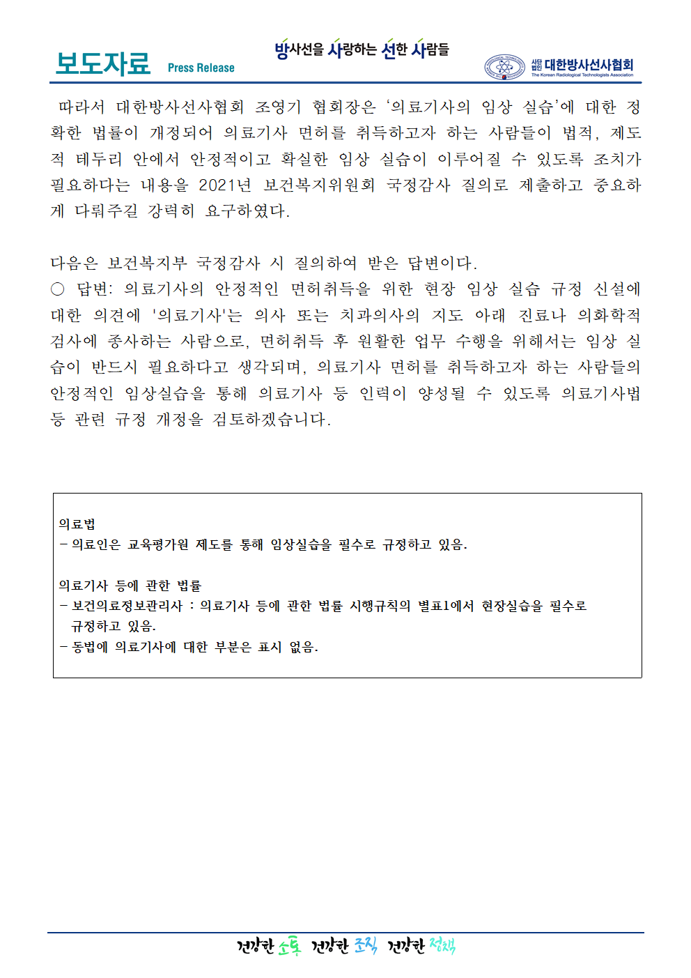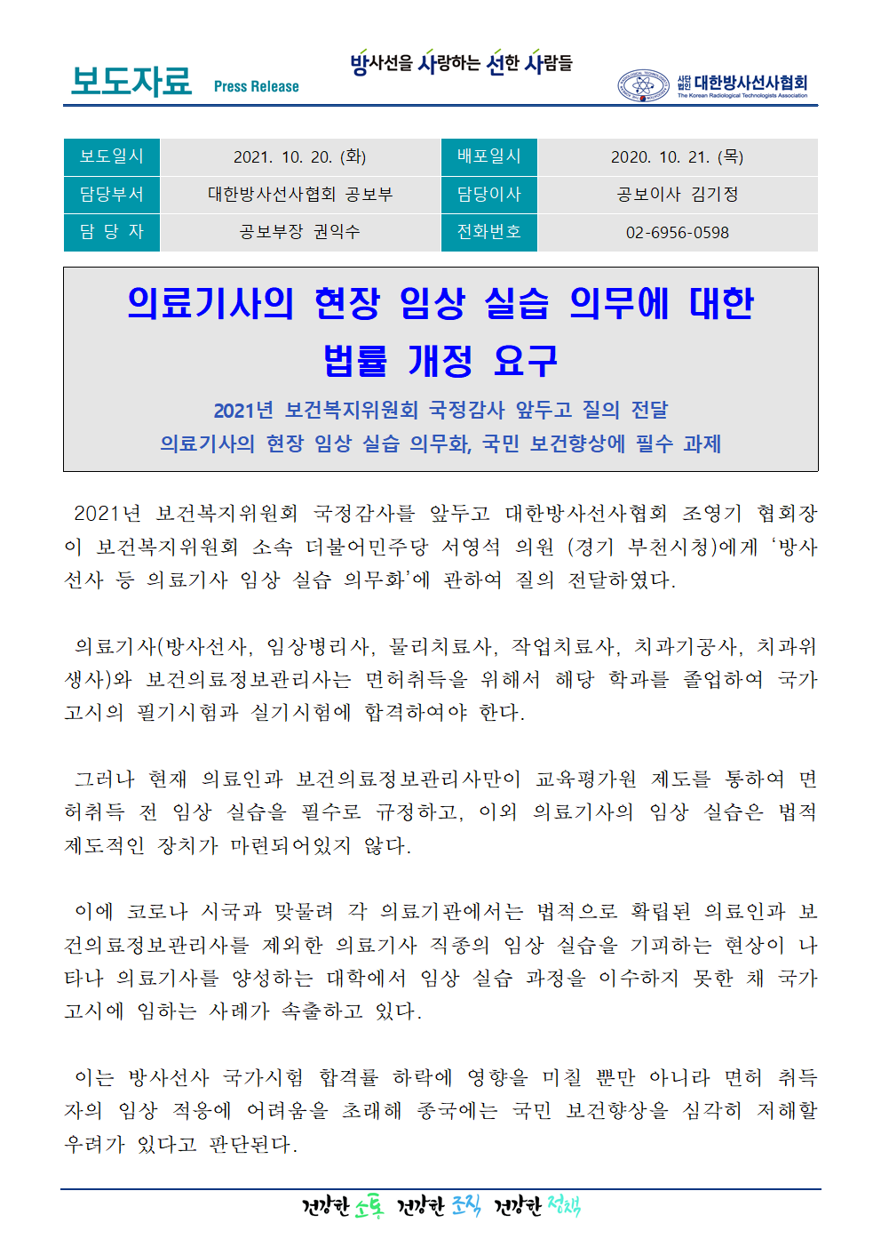 [공보부32] 의료기사의 현장 임상실습 의무에 대한 법률 개정 요구 페이지 정보 작성자관리자6 댓글0 조회4,724 작성일21.10.29 09:05 첨부파일 보도자료32(2101021)_의료기사 현장 임상실습 의무에 대한 법률 개정 요구.pdf (135.6K) 54회 다운로드 본문 Comment 0 댓글목록 등록된 댓글이 없습니다.