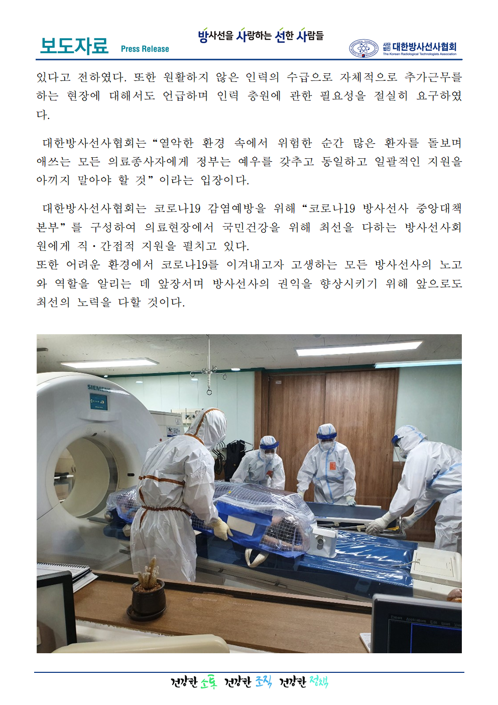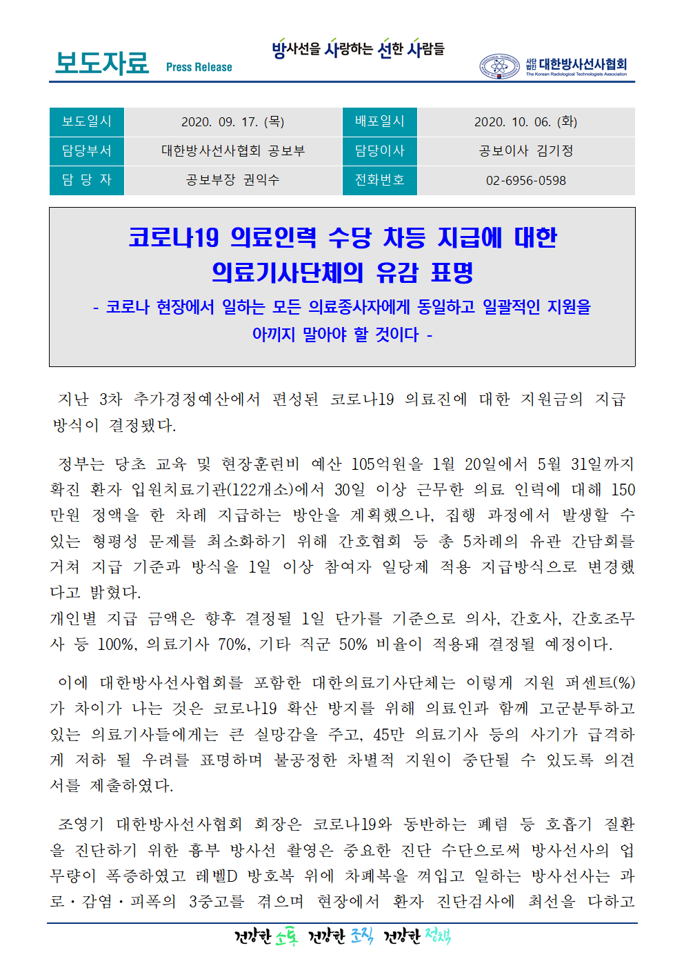 [공보부10] 코로나19 의료인력 수당 차등 지급에 대한 의료기사단체의 유감 표명 페이지 정보 작성자관리자6 댓글0 조회5,038 작성일20.10.06 15:42 첨부파일 보도자료10(20200917)_코로나19 의료인력 수당 차등 지급에 대한 의료기사단체의 유감 표명.pdf (483.3K) 58회 다운로드 본문 . Comment 0 댓글목록 등록된 댓글이 없습니다.